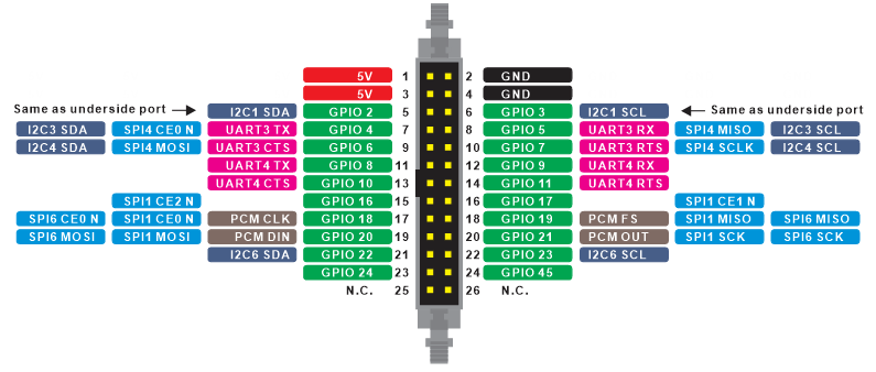 The GPIO ports of the CPi-S series have the same layout as the original Raspberry Pi, but there are some differences. Some ports (RS232, 485) are already connected elsewhere and are not available on the GPIO ports. There is an internal buffer chip for ESD protection.