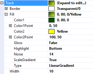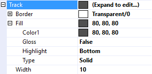 The Track property is used to customize the appearance of the track that the thumb slides along. It uses the same features described in Fills, Strokes, and Borders and Highlights and Gloss.
