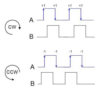 | 1 = encoder counter that counts up or down based on the phase difference between A and B | |