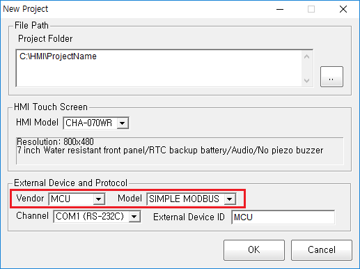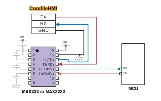 The ComfileHMI's RS-232 ports are PC-level (+/-12V), so it may be necessary to adapter your MCU's 5V or 3.3V UART signals.