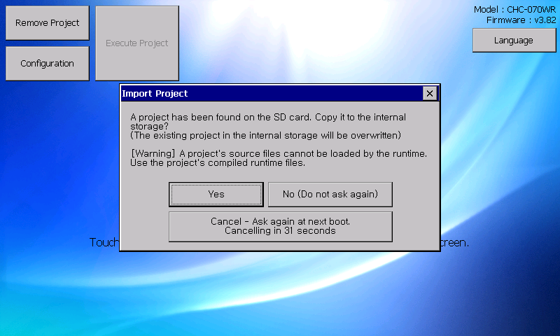 Now this microSD card becomes the storage medium. There is no need to connect the PC to other HMI devices individually. If you insert only this mircoSD card and turn on the power, the following screen is displayed.