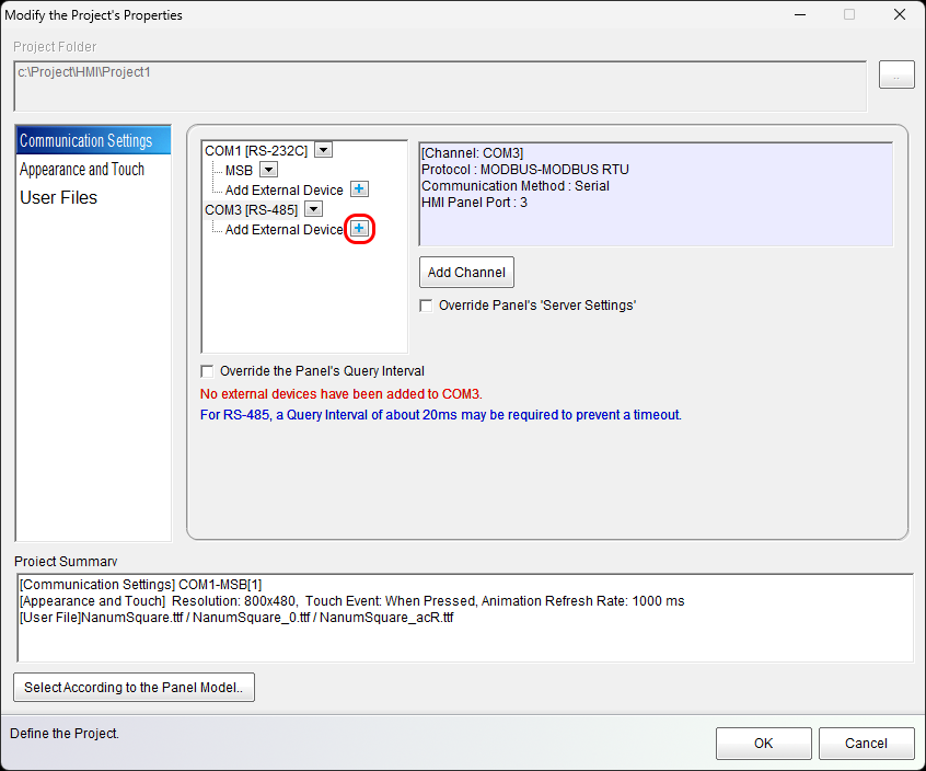 Selecting the Set HMI's communication settings when project is deployed to set the HMI's serial settings in the Comfile Studio project. Otherwise, the HMI's serial settings can be set by touching the HMI's top-right corner of the screen 5 times to enter the System Screen and make serial settings there.