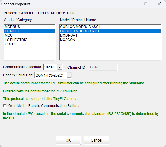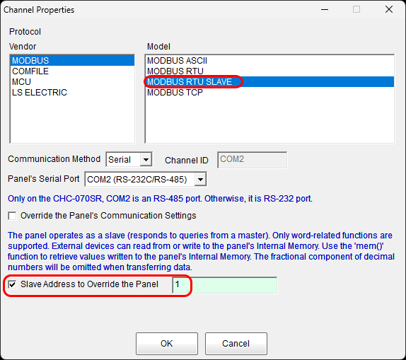 After setting up a communication channel, it is possible to configure it as a Modbus slave. This is a useful feature for monitoring or controlling the ComfileHMI and potentially it's connected slaves from an upstream SCADA system.