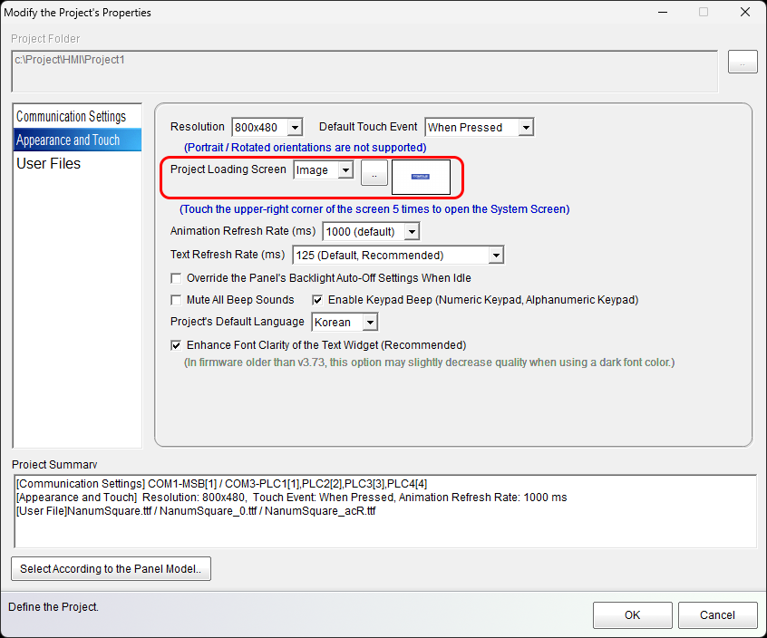When the project is first loaded, the ComfileHMI can display a splash screen (e.g. a company logo), or simply load the project's initial screen.