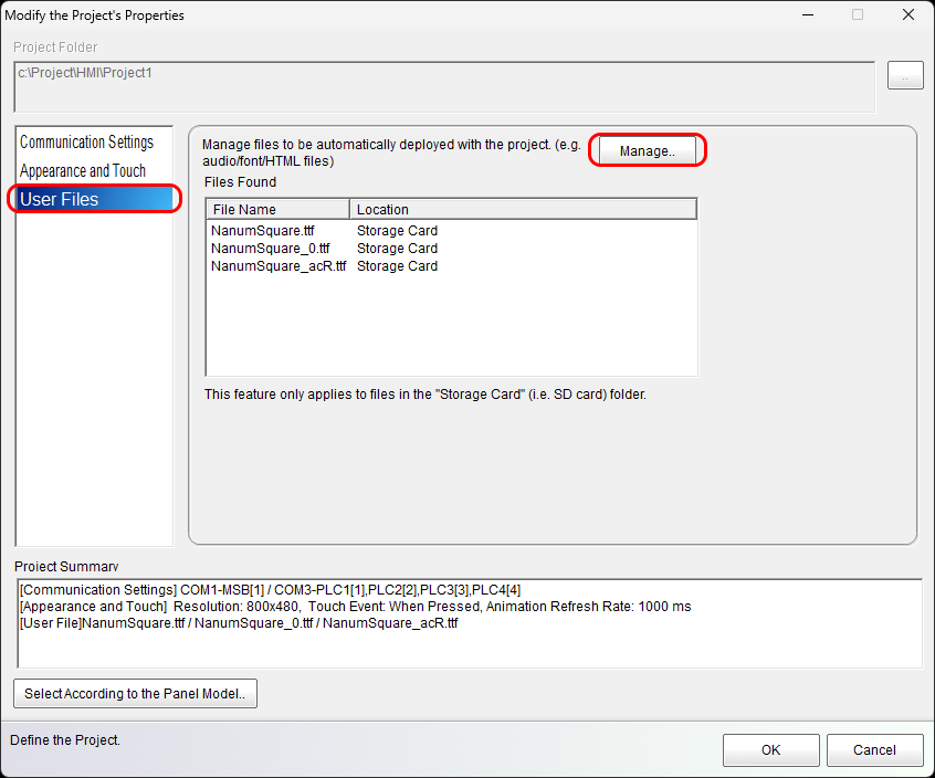In the User Files options, select files to be automatically uploaded to the ComfileHMI hardware when the project is deployed.