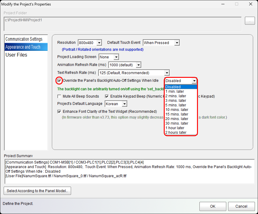 Select the Override the HMI Device's Screen Saver Settings option to have the project settings determine the inactivity timeout before the LCD's backlight turns off.
