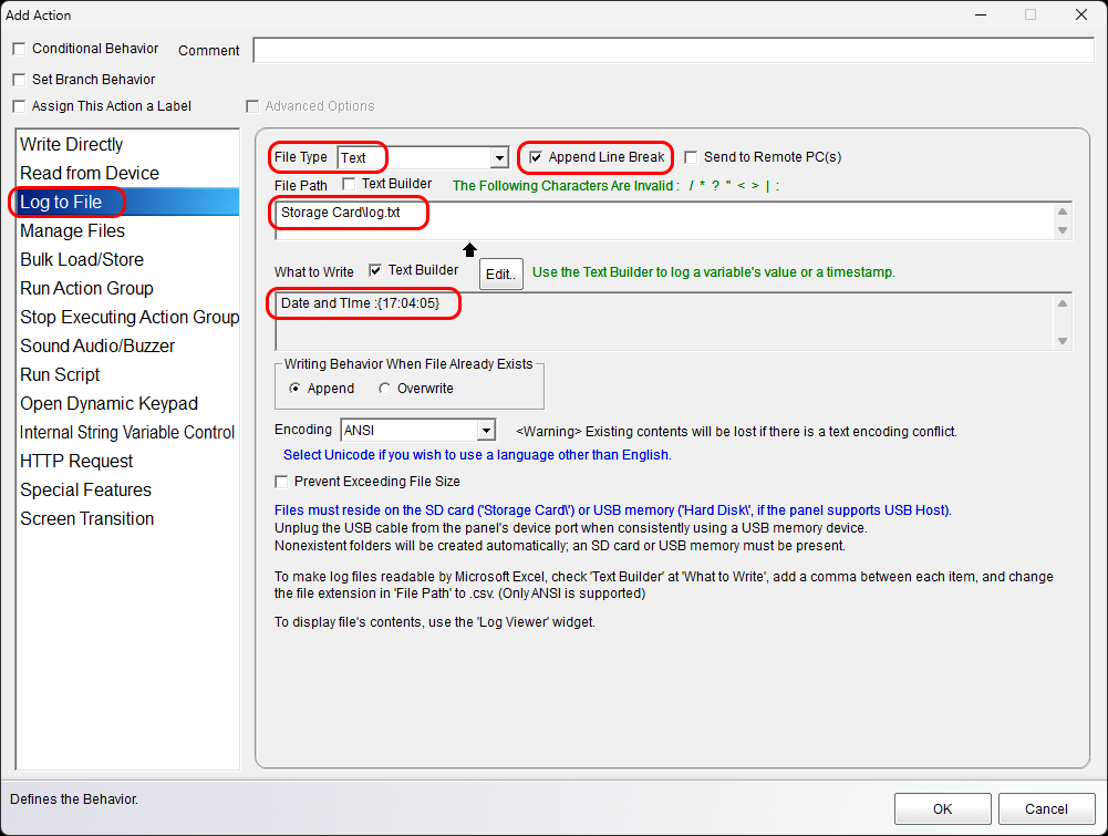 Set the path of the file to log to and use the Text Builder to specify the text to write.