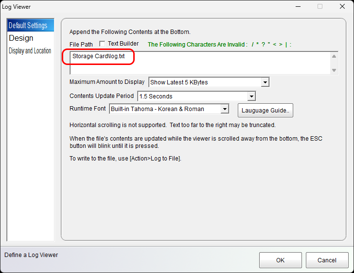 After placing the Log Viewer widget on the screen, double-click it to open its properties window as illustrated below. In the properties window, specify the path of the file to display.