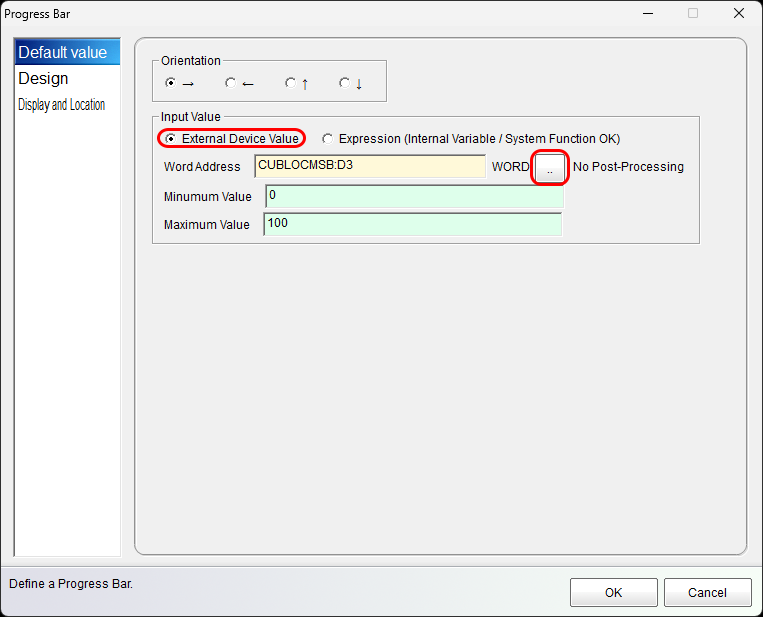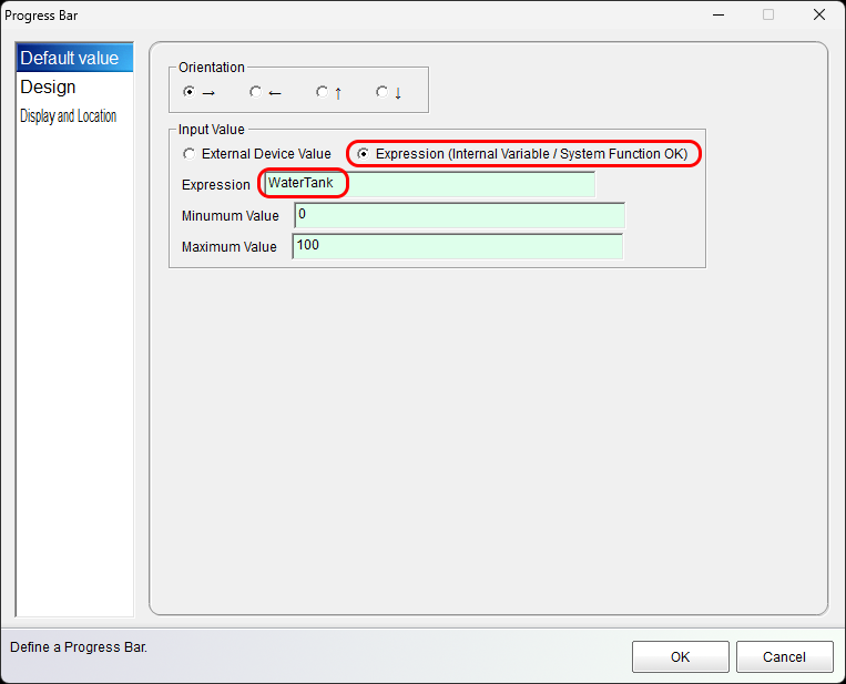 Add a Progress Bar widget to the screen and double-click it to open its properties window