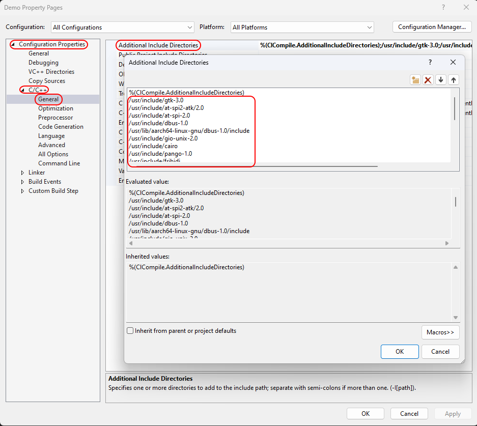 - Modify the C/C++–>General–>Additional Include Directories with the following: