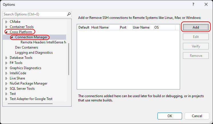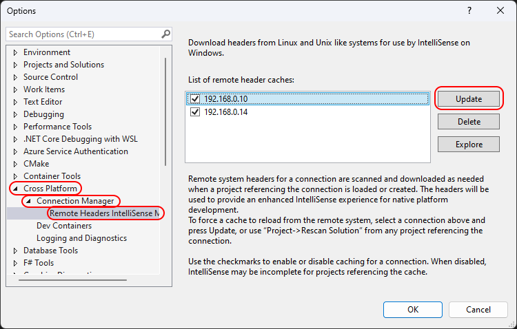 If you encounter any Intellisense errors, try synchronizing Visual Studio's copy of the ComfilePi's header files in Tools–>Options–>Cross Platform–>Connection Manager–>Remote Headers Intellisense Manager by selecting the appropriate connection and pressing the Download or Update button.