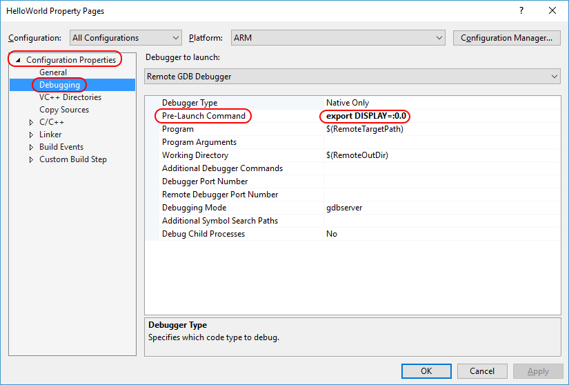 The Visual Studio Linux Features do not inherently support cross-compiling on a Windows PC. Instead, Visual Studio will upload the the source files to the ComfilePi, and use the ComfilePi's toolchain to build the executable. The executable is then executed on the ComfilePi, and the Visual Studio Remote GDB Debugger attaches to it.