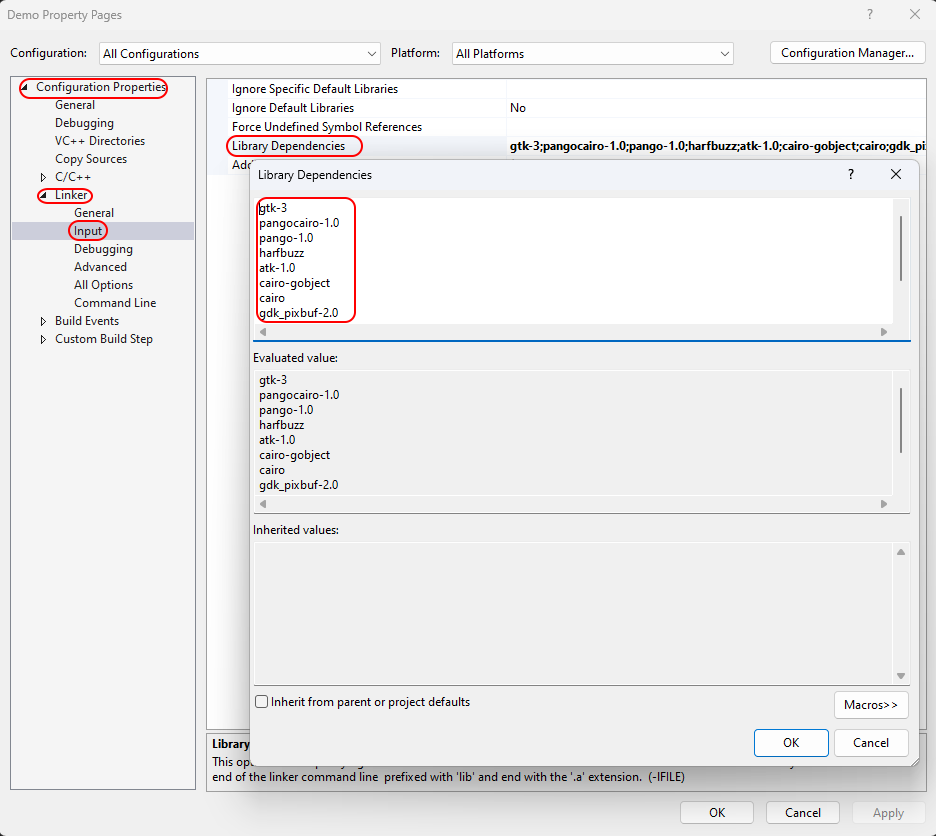 - The prior step will solve the Intellisense errors, but there will still be linker errors when the project is compiled. To resolve those errors, add the following library dependencies.