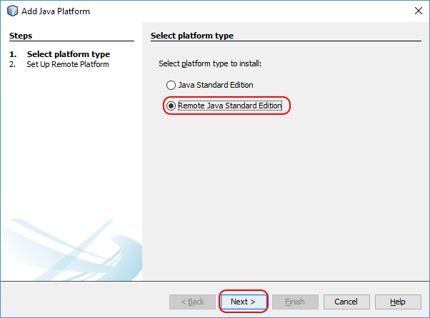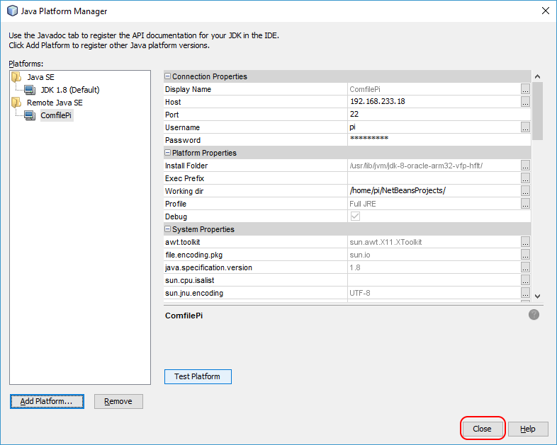 - Give the platform a meaningful name, enter the IP address and user credentials of the ComfilePi, and set the Remote JRE Path to