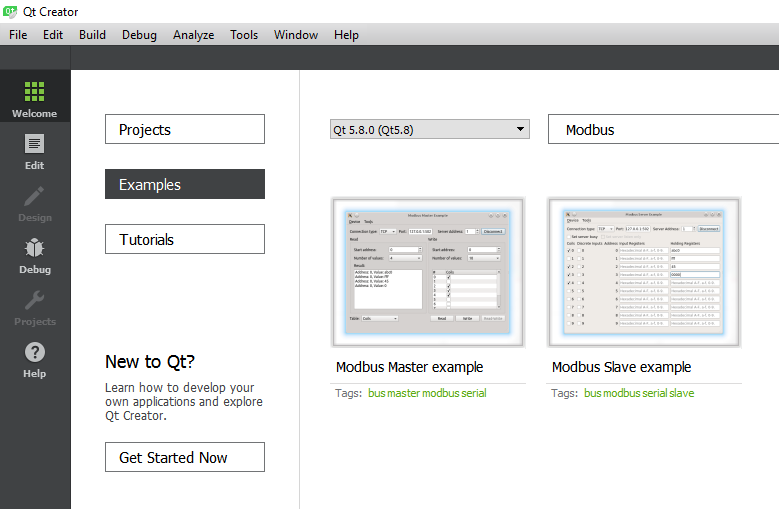 The Qt Modbus component supports both Modbus RTU and Modbus TCP. There is both a Modbus Slave and a Modbus Master example installed with the Qt SDK. They both use Qt Widgets.