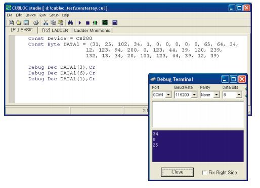 Const Byte DATA1 = (31, 25, 102, 34, 1, 0, 0, 0, 0, 0, 65, 64, 34) I = 0 A = DATA1(I) ' Store 31 in A. I = I + 1 A = DATA1(I) ' Store 25 in A. Const Byte DATA1 = ("CUBLOC SYSTEMS")