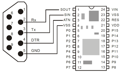 SIN, SOUT, ATN are RS-232 communication pins used to interface with a PC for downloading, debugging, monitoring, and serial communication. All Cubloc models have SOUT, SIN, and ATN pins and are connected to a DB-9 connector (PC serial port) as shown below.