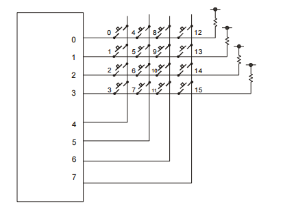 Pullup resistors (2.2K to 10K) should be connected to the lower 4 bits of the port block. A resistor should be connected even if a row is not being used. Please refer to the diagram below: