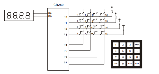 Const Device = CB280 Set I2c 9,8 Dim i As Integer Dim K As Integer Const Byte KEYTABLE = (1,4,7,10,2,5,8,0,3,6,9,11,12,13,14,15) Do i = Keypad(0) If i < 16 Then i = KEYTABLE(i) Csgdec 0,i End If Loop