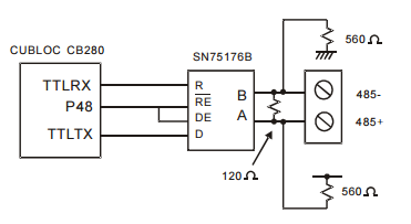 You can refer to the following circuit schematic for connecting TTL signals from a CB280 to the RS485 chip, SN75176B:
