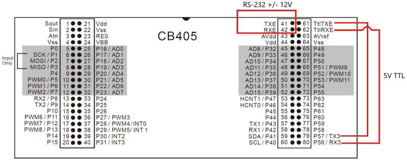 The CB400/405/405RT modules also have a built-in MAX232 level converter to convert the 5V TTL UART signals to +/-12V RS-232 signals. To utilize the level converter, connect a serial port's RX and TX pins to the TTLRXE and TTLTXE pins respectively, and then the RS-232 level signals for those pins will be available on the RXE and TXE pins.