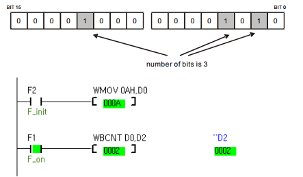 Counts the number of active bits (1s) in s in stores the result in d. WBCNT operates words (16 bits) and DWBCNT operates on double words (32 bits).