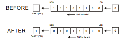 Shifts arg one bit to the left and fills the carry bit (F72). WRCL operates on words (16 bits) and DWRCL operates on double words (32 bits).