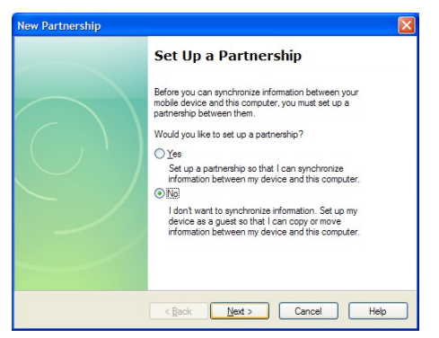 9.ActiveSync will then prompt you to create a partnership between the PC and the CUWIN. Make your selection. If you're not sure, just choose “No”. Then click the “Next” button.