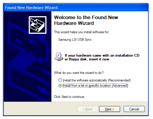 3. After connecting the CUWIN to the PC, the “Found New Hardware Wizard” will appear. Select “Install from a list or specific location(Advanced)” and click the “Next” button.
