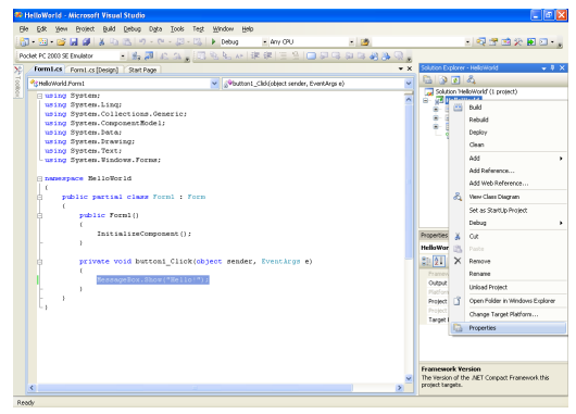 “Hello World” project node in the “Solution Explorer” window, and choose “Properties”.