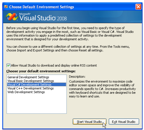 C# Development Settings”. Then click the “Start Visual Studio” button.