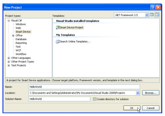 5. Select “Visual C#”→“Smart Device” from the “Project Types” tree, and “Smart Device Project”