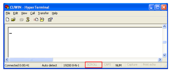 3. Hyperterminal will not accept keyboard input until the Scroll Lock is turned off. Press the “Scroll Lock” key on your keyboard until the status bar shows “Scroll” in gray (disabled). Now if we type in HyperTerminal, what we type will display on the screen and will be sent to the CUWIN.
