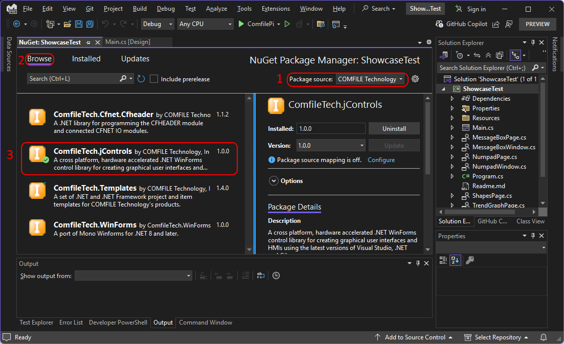 Once the COMFILE Technology Nuget source is installed, you can view all of COMFILE Technology's .NET library and template packages from within Visual Studio, and install them at will.