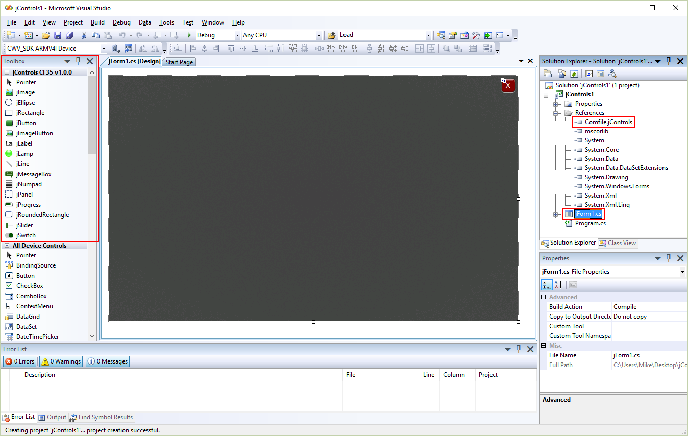 Create the project using that template, and a new project will appear with a default jForm. A reference to the Comfile.jControlsCF35 assembly will be automatically added, and all controls in the jControls CF35 library will appear in the Visual Studio toolbox.