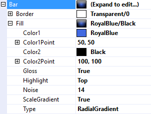 The Bar property is used to customize the appearance of the part of the control that indicates progress. It uses the same features described in Fills, Strokes, and Borders and Highlights and Gloss.