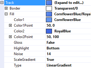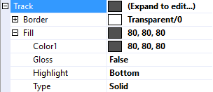 The Track property is used to customize the appearance of the track that the bar travels along. It uses the same features described in Fills, Strokes, and Borders and Highlights and Gloss.