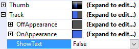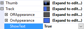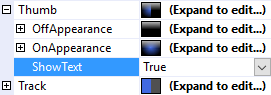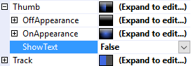 The Text property is a .Net format string that specifies the text to display on the thumb or the track. The only argument, {0}, is the value of the IsOn Property.