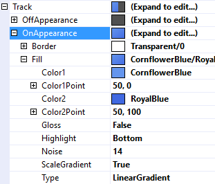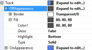 The Track property is used to customize the appearance of the track that the thumb slides along. It uses the same features described in Fills, Strokes, and Borders and Highlights and Gloss.