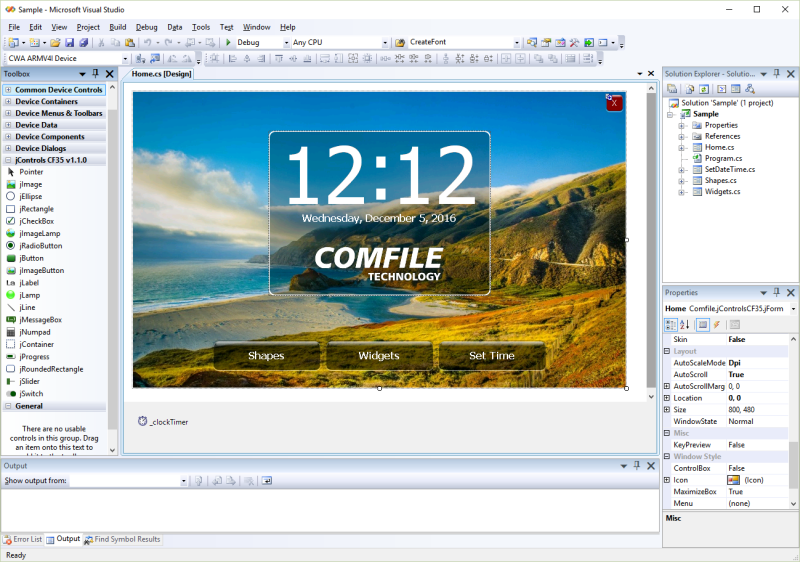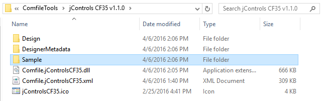 After installing jControls CF35, a sample project can be found in the installation directory (e.g. “C:\Program Files (x86)\ComfileTools\jControls CF35 v1.1.0”)