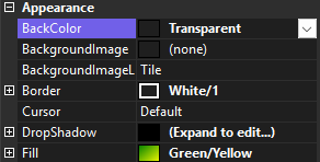 Many of the properties in jControls NF4 have Fill properties and Border properties. The Fill property is used to color the interior region of the control, and the Border property is used to color the outer perimeter of the control.