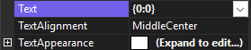 The Text property is a .NET format string that specifies the text to display on the control. The only argument, {0}, is the value of the Value property. The characters after the : define the format.