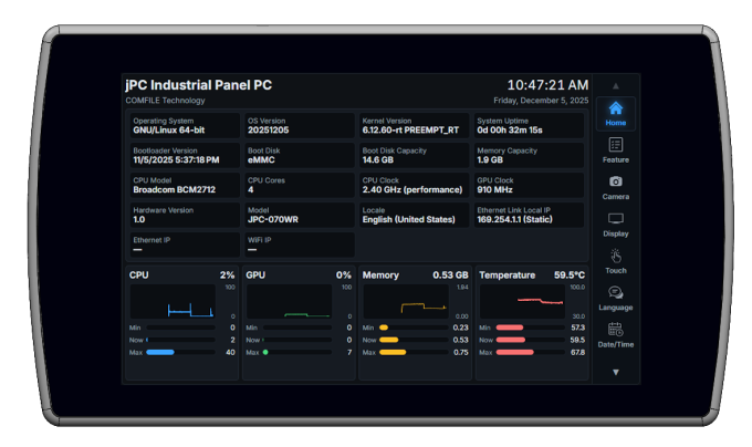 Also, the jPC's operating system is much more full-featured than Windows CE or Windows Embedded Compact. It provides a modern web server, a modern web browser (for Kiosks), remote desktop, secure shell, and much, much more. It may be small and compact, but it can be more capable than many Windows x86 industrial panel PCs while still being programmed like one.