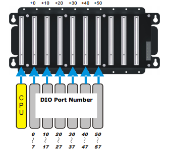 General Digital I/O (DIO) modules can be installed in the 6 slots directly to the right of the CPU module in the slots labeled “DIO”. The slot in which the DIO module is installed determines its I/O port number.