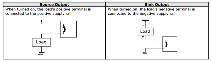The Sink Output Module has a wider output voltage range than the Source Output Module. DC Output Modules can output a pulse of up to 1KHz meaning it can be switched on and off at about 1000 times per second.