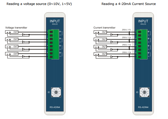The AD Input Modules can be wired to read voltage sources or current sources. When reading voltages sources, the modules can be configured for a 0 ~ 10V range or a 1 ~ 5V range using the dipswitch on the side of the module. When reading a current source (4-20mA), connect a 250ohm resister across the input terminals.