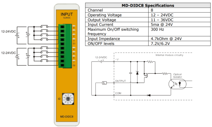 On the front of the module, there is a rotary switch labeled ID, that is used to select the Modbus slave address for the module. When installing multiple modules of the same type, the ID for each module should be unique.