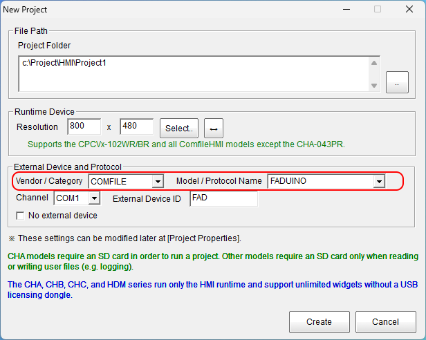 When creating a project in Comfile Studio (ComfileHMI drawing software), select the options below.