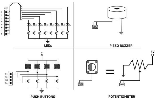 | On-board Components | LEDs, I2C display port, ADC potentiometer, piezo buzzer, push buttons |