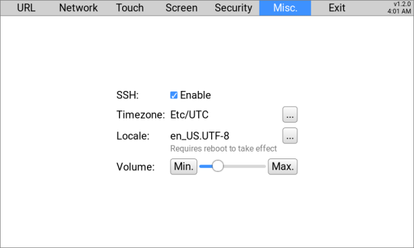- Locale - Change the panel PCs locale. The locale also determines the UI language of the WebMon application software. Currently only English and Korean translations have been created.